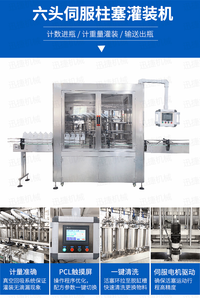 全自動16頭伺服柱塞灌裝機是我公司精心設計的新款灌裝機,本伺服柱塞灌裝機,采用PLC和觸摸屏自動化控制,具有計量準確、結構運行平穩、噪音低、調節范圍大、灌裝速度快等優點。而且對易揮發、易結晶、易起泡的液體;對橡膠、塑料有極強的腐蝕的液體,以及高粘度的液體、半流體都能適應。在人機界面數字化調節計量,并且可設定100ml或200ml等所需計量,觸摸屏一觸即達,而且可以單頭微調計量。