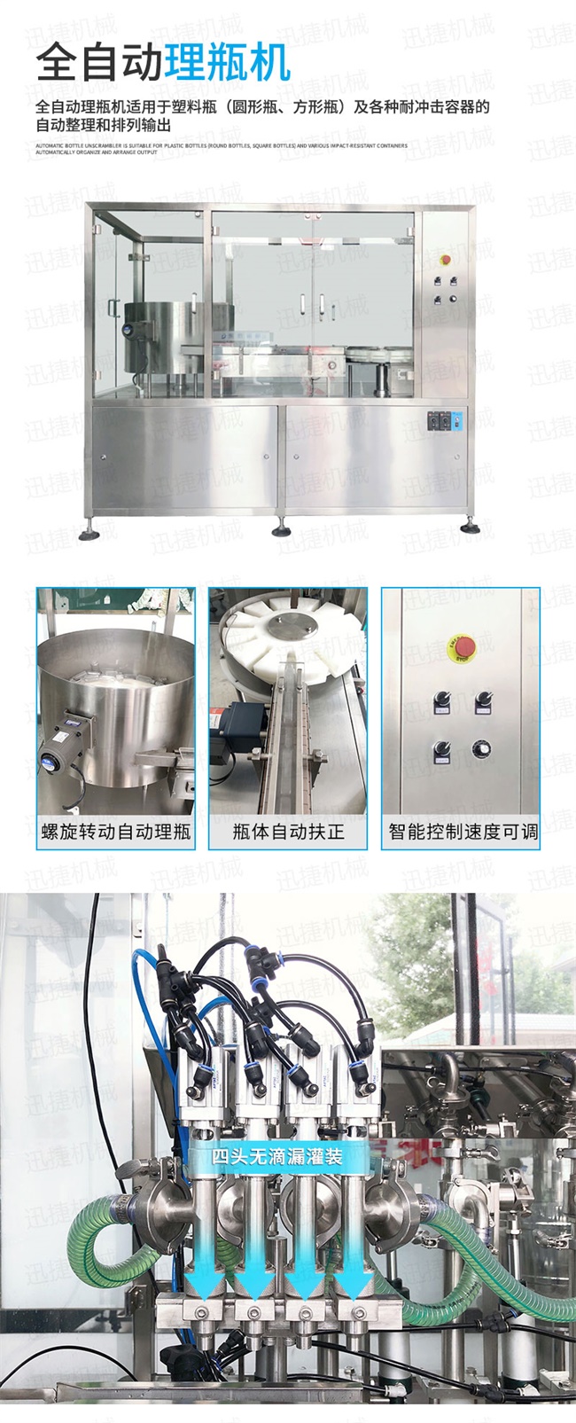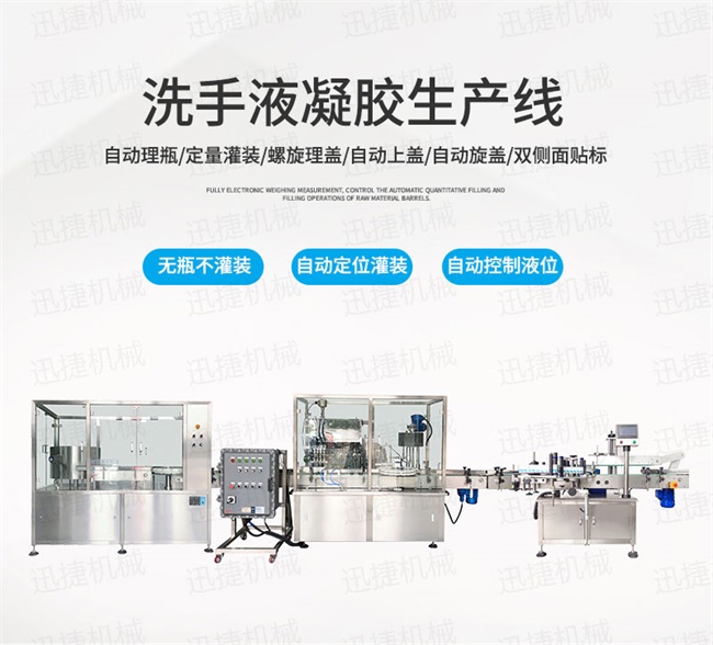 全自動(dòng)凝膠生產(chǎn)線適用于消毒凝膠、免洗手洗手液、免洗手消毒凝膠、消毒液、84消毒液、醫(yī)用酒精、75%酒精消毒液、75度酒精、消毒水、殺菌消毒劑、醫(yī)用酒精、碘酒、次氯酸鈉、劑、醫(yī)用乙醇消毒液、瓶裝消毒劑等產(chǎn)品,有多頭全自動(dòng)消毒液灌裝機(jī)和封箱機(jī)、貼標(biāo)機(jī)、打包機(jī)、噴碼機(jī)等配套設(shè)備組成,實(shí)現(xiàn)消毒液自動(dòng)灌裝,自動(dòng)旋蓋,自動(dòng)貼標(biāo),從灌裝、到成品的全部過(guò)程