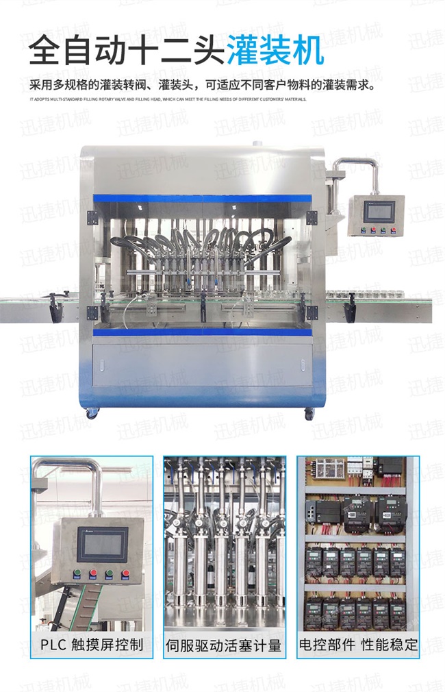 2、灌裝機(jī)以進(jìn)口PLC電腦控制、伺服驅(qū)動計(jì)量,全彩色觸摸屏人機(jī)界面,一鍵完成計(jì)量切換確保容量之調(diào)整簡易、快捷、準(zhǔn)確。是任何形式的灌裝機(jī)無法替代的;