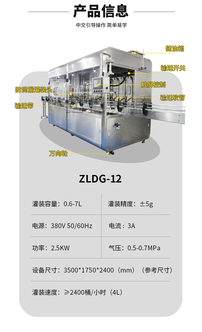 該灌裝機可以配置 高速旋蓋機 油桶貼標機 油瓶噴碼機 油壺自動自動裝箱碼垛機。組成油脂灌裝包裝流水線。高效、節能、自動化的設備。