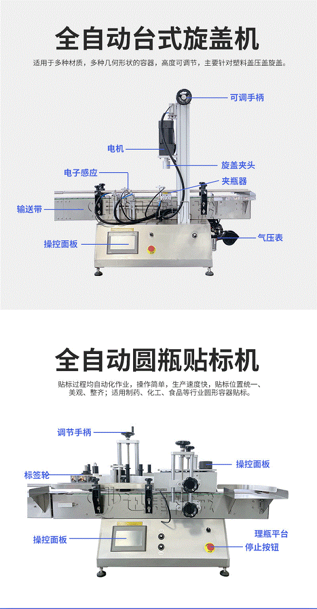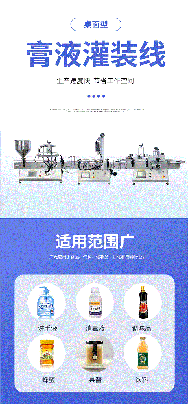 產品說明:生產線根據灌裝范圍選擇型號,灌裝部分為雙頭下潛式灌裝機,適用于不同物料不同瓶子的灌裝,配備自動壓蓋機和圓瓶貼標機,可實現不同蓋子的旋蓋貼標工作。 本設備主要適用于食品、日常化工、農藥、醫藥和特殊行業。灌裝精度將受氣壓的穩定性、物料的均勻性、灌裝速度等的影響。