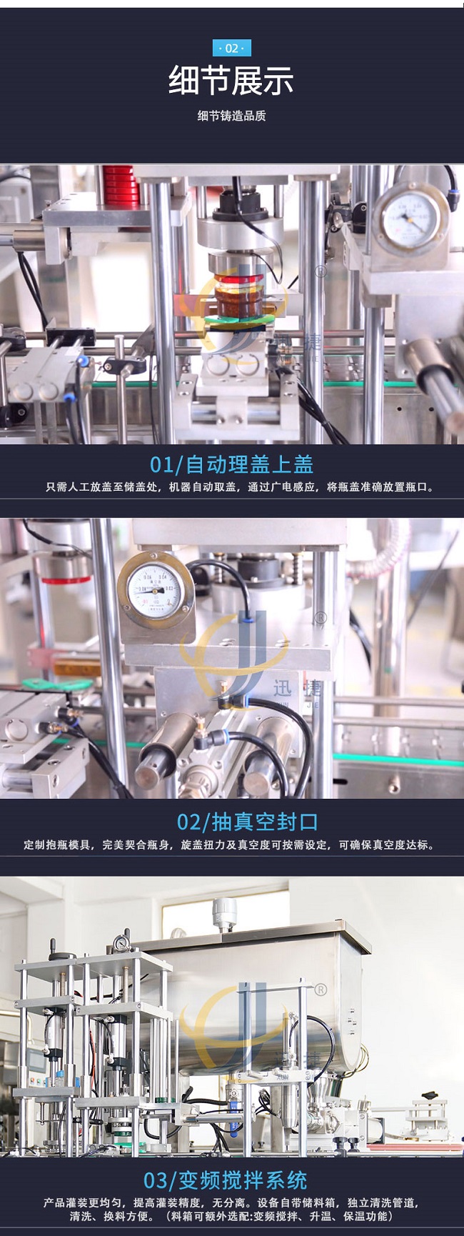 迅捷機械加工設備齊全,技術力量雄厚,選用德國PLC控制系統、臺灣AirTac的氣動組件和臺灣伺服的電控組件,從這幾個部件可以看的出來全自動牛肉醬灌裝機改善的不僅是質量,生產效率和產品的外觀包裝,還會不斷的引進國際上新的科學技術,全自動牛肉醬灌裝機用更好的質量滿足生活的需求。在自動化生產日漸普及的今天,全自動牛肉醬灌裝機讓企業的商品以更快的速度出現在市場中,畢竟一些繁雜的工作讓人工去完成的話不但麻煩,效率也不會很高,想要適應現代化的大規模批量生產,就需要全自動牛肉醬灌裝機的幫助來代替人工完成這些繁雜的工作。